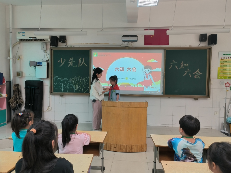 入隊前夕,一年級的中隊輔導員們(men) 利用隊課向學生們(men) 教授“六知六會(hui) ”的少先隊知識,為(wei) 學生入隊打下堅實的基礎。通過學習(xi) ,一年級的學生們(men) 第一次了解了中國少年先鋒隊這個(ge) 組織,第一次學唱響了隊歌,學會(hui) 了如何係紅領巾,第一次認識了隊旗、隊徽……孩子們(men) 對入隊充滿了期待和向往。