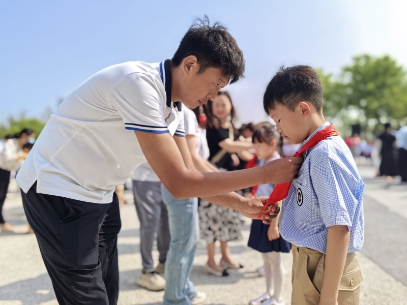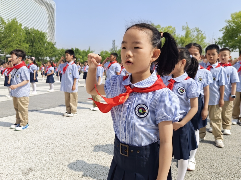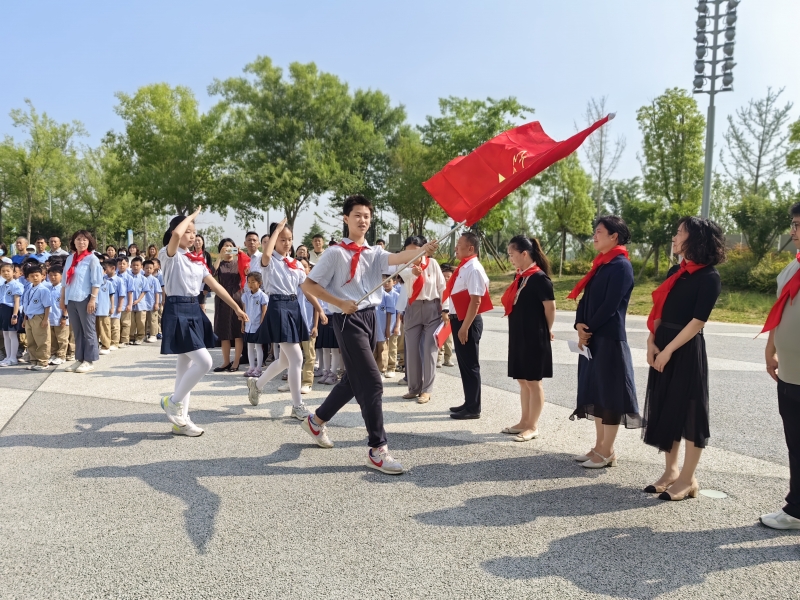 5月24日上午,鄭州市經三路小學“科技夢 先鋒行”一年級首批新隊員入隊儀(yi) 式在河南省科技館隆重舉(ju) 行。一年級全體(ti) 師生、校領導及家長代表全程參與(yu) ,科技館領導應邀出席。儀(yi) 式在少先隊出旗曲中拉開序幕。伴隨著莊嚴(yan) 的出旗曲,旗手們(men) 昂首闊步。在大隊委員閆若熙的指揮下,同學們(men) 高唱《中國少年先鋒隊隊歌》,歌聲嘹亮,響徹整個(ge) 廣場。