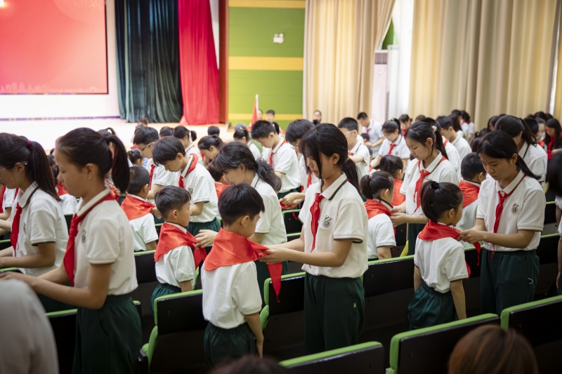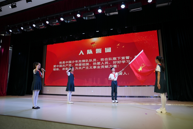 伴著激昂的旋律,旗手手執鮮豔的大隊旗和護旗手邁著鏗鏘的步伐拉開了入隊儀(yi) 式的序幕。少先隊員們(men) 莊嚴(yan) 迎旗,唱響《中國少年先鋒隊隊歌》,儀(yi) 式上,道德模範代表、嘉賓代表、黨(dang) 員家長代表、高年級隊員為(wei) 146名新隊員佩戴紅領巾,一同見證他們(men) 入隊的光榮時刻,新少先隊員們(men) 麵向隊旗莊嚴(yan) 宣誓。星星火炬,代代相傳(chuan) ,學校黨(dang) 支部書(shu) 記、少工委主任為(wei) 新建中隊授中隊旗,為(wei) 新建中隊的中隊輔導員頒發聘書(shu) ,並對新隊員們(men) 提出希望和要求,勉勵他們(men) 注重修養(yang) 、勤奮學習(xi) ,爭(zheng) 當德智體(ti) 美勞全麵發展的好少年。