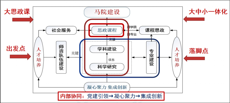 分解基本思路和圖示內(nei) 容,需要把握好馬克思主義(yi) 學院建設中的“散點發展”,通過整體(ti) 提升計劃,實現“集成創新”,其主要著力點應充分體(ti) 現馬院職能,內(nei) 涵有思政課程改革、馬理學科建設、科學研究提升、隊伍量質並舉(ju) 、專(zhuan) 業(ye) 人才發展、社會(hui) 服務質量、黨(dang) 建引領作用等方麵。