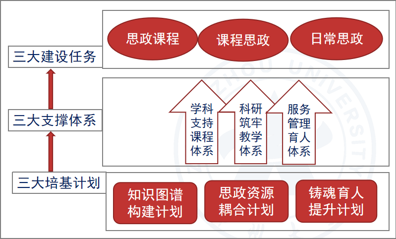 著力大思政課建設理路。“大思政課”,我們(men) 要善用之。立德樹人根本任務的要求,推動用黨(dang) 的創新理論鑄魂育人,需要推進“大思政課”建設。按照教育部等十部門關(guan) 於(yu) 印發《全麵推進“大思政課”建設的工作方案》的通知,需要做好“大思政課”建設的總體(ti) 謀劃和實踐推進。為(wei) 此,要落實辦好立德樹人的關(guan) 鍵課程、深化課程思政的協同效應、做好學生的日常思政工作的“三位一體(ti) ”建設任務;要推進學科支持課程、科研築牢教學、服務育人管理的“三大支撐”體(ti) 係建構;要加強知識圖譜構建、思政資源耦合、鑄魂育人提升的“三大培基”實施計劃。