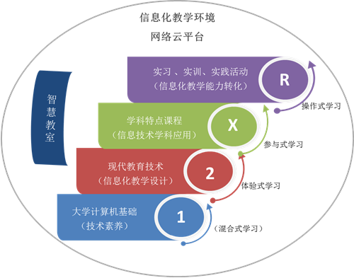 構建信息化教學課程體(ti) 係。安陽師範學院通過全麵修訂師範類專(zhuan) 業(ye) 人才培養(yang) 方案,不斷優(you) 化課程體(ti) 係,重構課程內(nei) 容,按照 “按需選課、滲透學科、全程實踐、雙師指導”的培養(yang) 策略,形成了“2+X+S”的課程體(ti) 係。如圖所示: