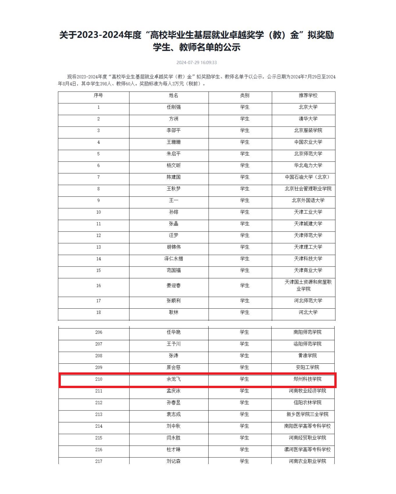 8月7日,記者從(cong) 鄭州科技學院獲悉,由中國教育發展基金會(hui) 公布的2023--2024年度“全國高校畢業(ye) 生基層就業(ye) 卓越獎”獲獎人選名單中,該校2015屆土木建築工程學院畢業(ye) 生餘(yu) 龍飛榜上有名,榮獲“全國高校畢業(ye) 生基層就業(ye) 卓越獎”,並獲得三萬(wan) 元獎勵。