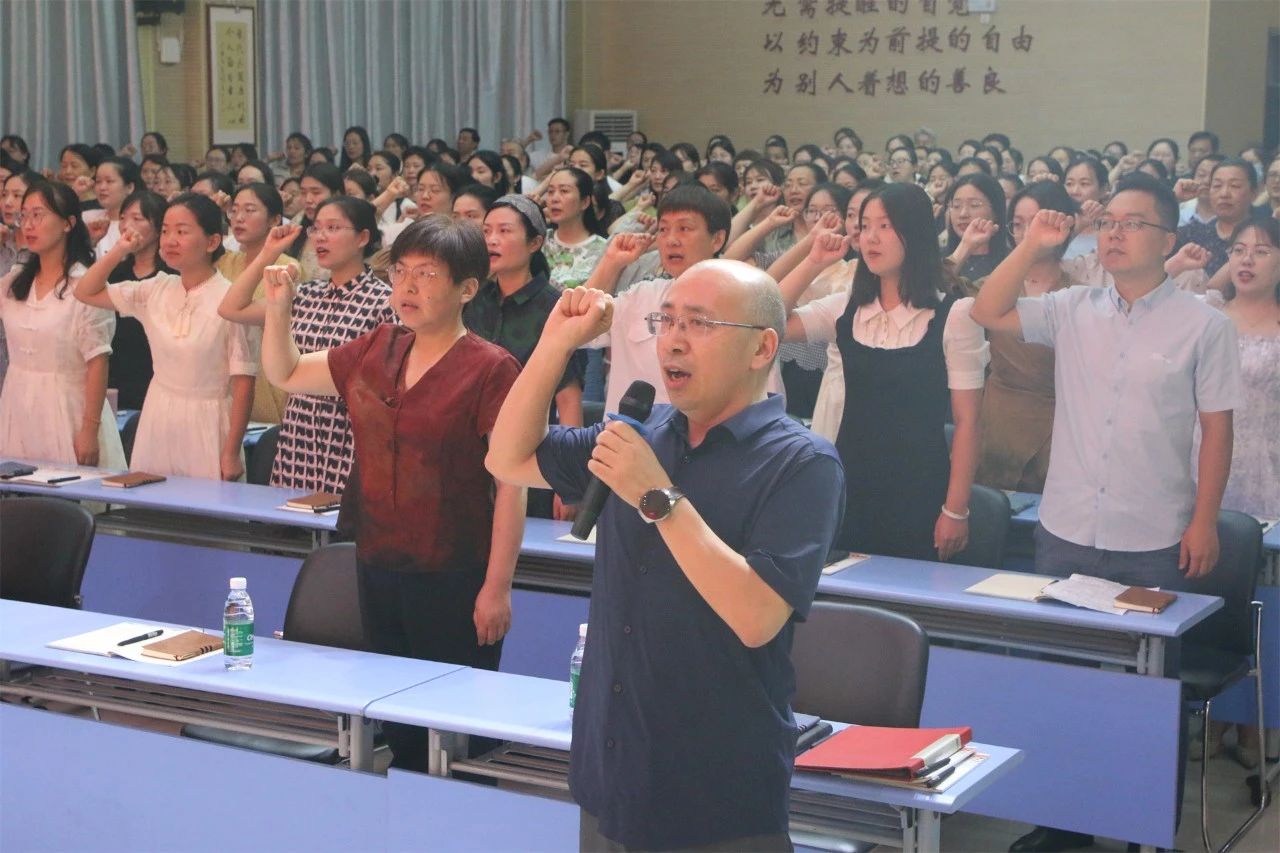 黨(dang) 總支副書(shu) 記、校長竇明奇帶領全體(ti) 教師重溫《濮陽市實驗小學教師誓詞》。“忠誠人民教育事業(ye) ,依法履行教師職責;秉承校魂如虹之氣,弘揚師表似水之德。教書(shu) 育人,尚水明德,愛崗敬業(ye) ,聚氣鑄魂;嚴(yan) 謹治學,啟智求真……”錚錚誓言再一次堅定了教師忠誠黨(dang) 的教育事業(ye) 的決(jue) 心,激發教師樂(le) 於(yu) 奉獻、踔厲奮發、篤行不怠、勇毅擔當的精神力量。