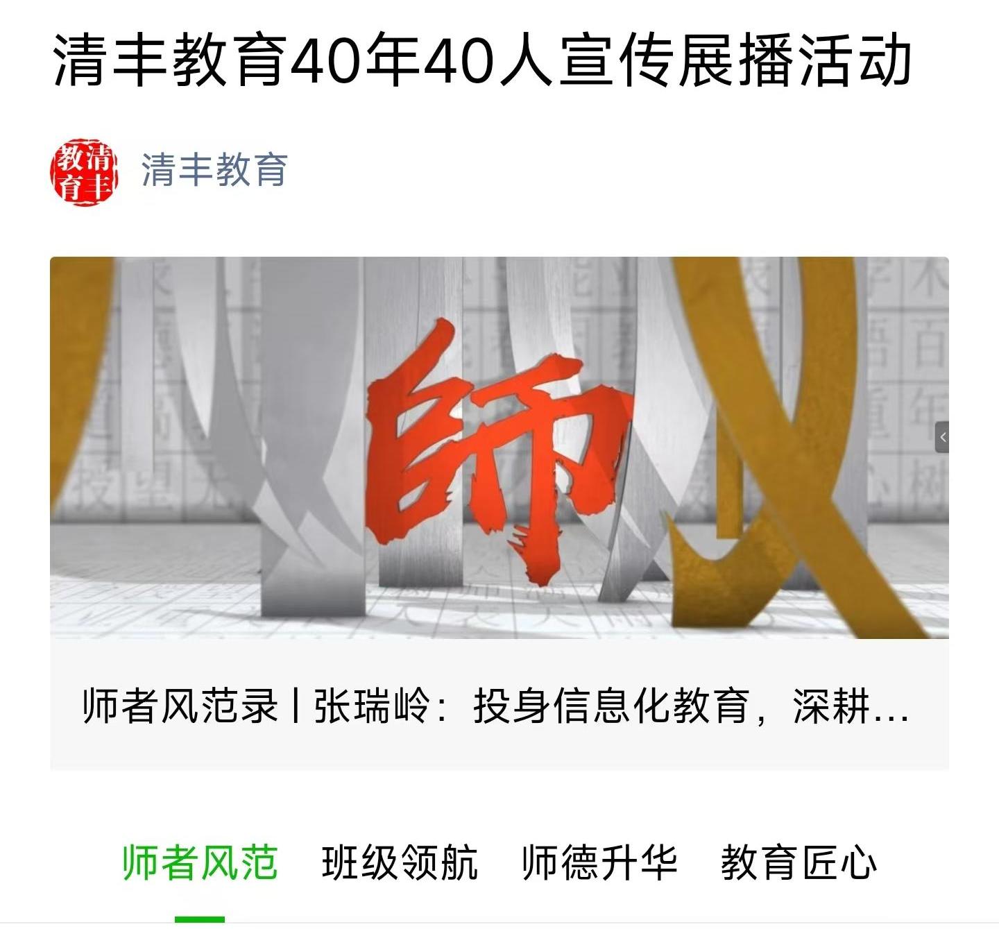 第40個(ge) 教師節來臨(lin) 之際,清豐(feng) 縣特別推出“清豐(feng) 師表40載”——清豐(feng) 教育40年40人宣傳(chuan) 展播活動。活動共分為(wei) 4個(ge) 專(zhuan) 欄,為(wei) “師者風範錄”“班級領航者”“師德升華坊”“教育匠心集”四大板塊,分別展播“優(you) 秀教師”“優(you) 秀班主任”“師德先進個(ge) 人”“優(you) 秀教育工作者”。