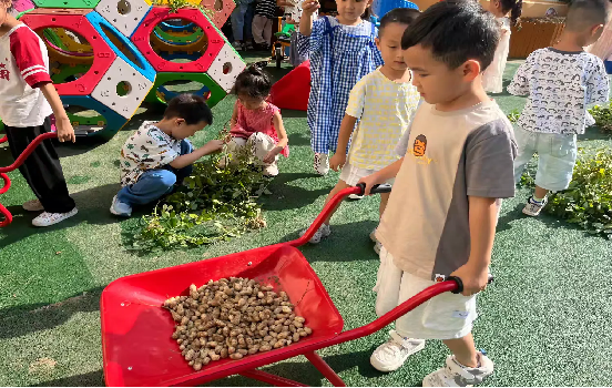 在進行戶外遊戲時,路過種植園,孩子們(men) 不由得興(xing) 奮地討論起來。走到花生種植區域時,“為(wei) 什麽(me) 沒有看到花生的果實呢”“是呀,為(wei) 什麽(me) ”,花生的話題勾起了幼兒(er) 的興(xing) 趣。“秋收花生”主題活動開始了……