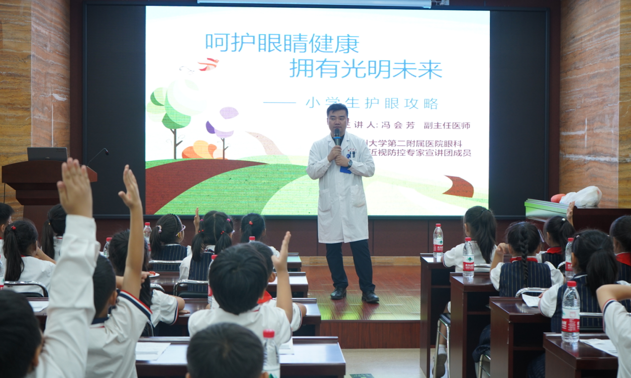 “眼睛能做什麽(me) ?”副主任醫師馮(feng) 會(hui) 芳醫生和同學們(men) 的趣味互動開啟了護眼講座。馮(feng) 醫生通過如何愛護我們(men) 的眼睛、了解近視的十大征兆、如何科學用眼等方麵,引導學生掌握正確的愛眼行為(wei) 。她提醒同學們(men) ,在日常生活中要注意用眼衛生、保證充足睡眠、定期接受視力檢測。同學們(men) 聽得津津有味,積極參與(yu) 互動。
