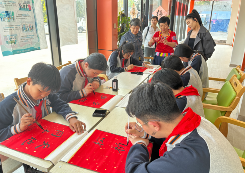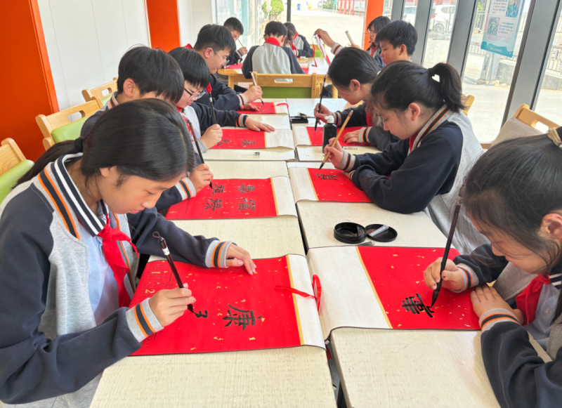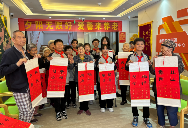 養(yang) 老院內(nei) 外洋溢著節日的喜慶氛圍,師生們(men) 受到了老人們(men) 熱情的歡迎。活動室內(nei) ,一張張長方形的書(shu) 案整齊排列,墨香四溢。學校書(shu) 法社團的同學們(men) 進行了現場創作,把美好的祝願寫(xie) 在火紅的掛曆上。“意氣風發”“壽與(yu) 天齊”“萬(wan) 壽無疆”,孩子們(men) 將祝福送給每一位老人。老人們(men) 看了讚歎不已,有的拿起毛筆切磋技藝,有的即興(xing) 創作,笑聲此起彼伏,氣氛溫馨而熱烈。