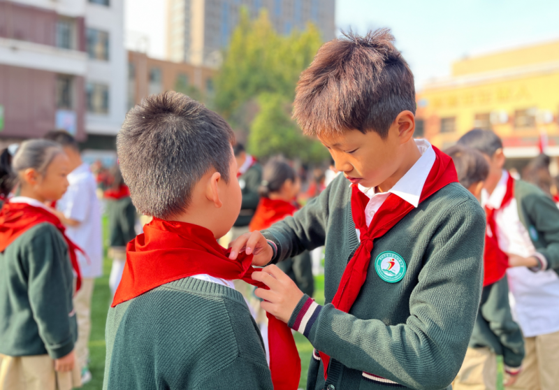 風華正茂少年時,薪火相傳(chuan) 譜華章。入隊是新的人生起點,入隊是更高的理想啟航。在新隊員幸福的笑臉與(yu) 期待中,五年級老隊員代表熱情地為(wei) 新隊員戴上鮮豔的紅領巾,見證他們(men) 成為(wei) 光榮的少先隊員。