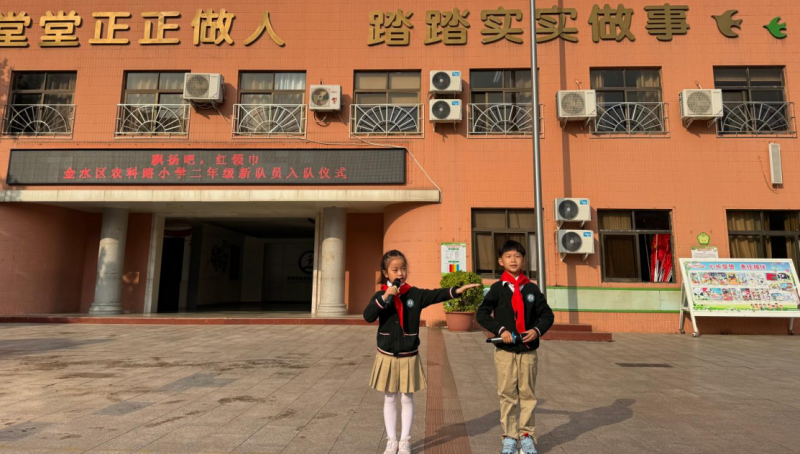 10月11日,在中國少年先鋒隊建隊75周年之際,鄭州市金水區農(nong) 科路小學隆重舉(ju) 行了“飄揚吧,紅領巾”新隊員入隊儀(yi) 式。伴著主持人清脆悅耳的聲音,全場肅立,入隊儀(yi) 式在莊嚴(yan) 而溫馨的氛圍中拉開序幕。