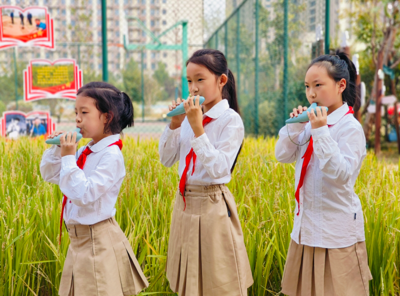 悠揚陶笛聲響起,金水區農(nong) 科路小學國基校區的師生以陶笛演奏《日光稻香》,淳樸舒緩的節奏讓人腦海中不禁浮現出一幅美好的豐(feng) 收風光——嘉禾園裏,陣陣稻香襲來,馥鬱芬香。
