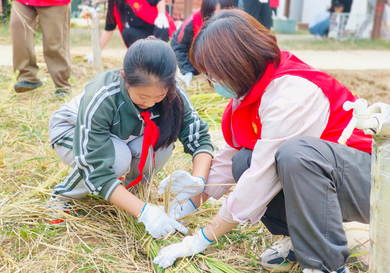 豐(feng) 收的“嘉禾園”是教育的活課堂。學校黨(dang) 員教師一手握住水稻頸部,一手握緊鐮刀,刀口傾(qing) 斜著向下用力,一邊講解,一邊演示。隊員們(men) 在認真聆聽老師講解收割稻穀的技巧和關(guan) 於(yu) 水稻的農(nong) 業(ye) 常識之後,分批走進豐(feng) 收的田裏,揮舞鐮刀割稻穀、拾稻穗、捆稻穀,個(ge) 個(ge) 揮汗如雨,體(ti) 驗著“粒粒糧食汗珠換”的辛勞,一派熱火朝天的勞動氛圍。
