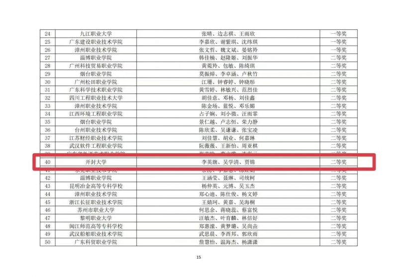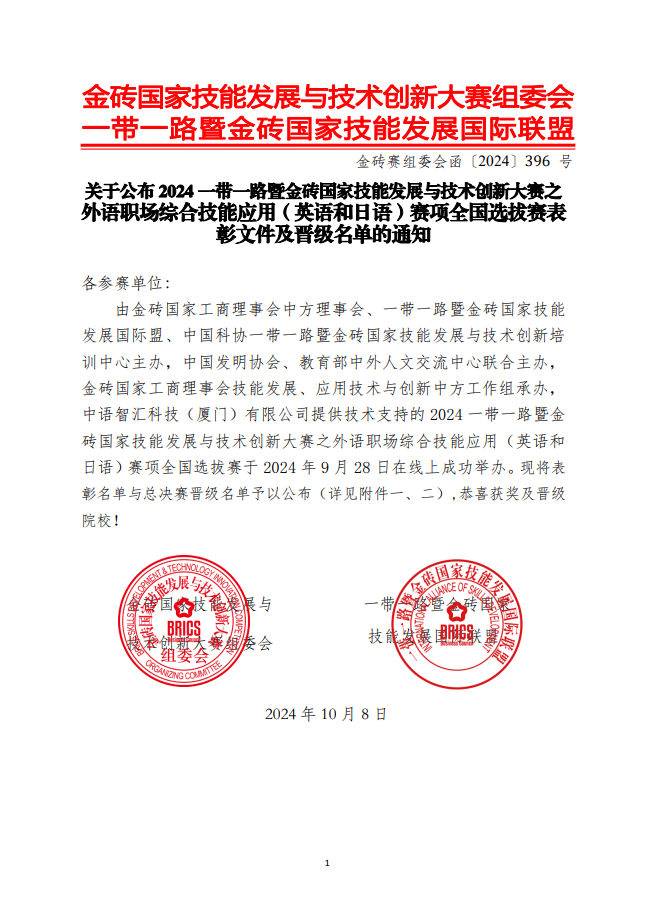 10月12日,一帶一路暨金磚國家技能發展與(yu) 技術創新大賽外語賽項全國選拔賽結束,國際教育學院(外國語學院)組成的6支隊伍分別獲得高職英語組二等獎、三等獎和優(you) 秀獎各1項,高職日語組三等獎1項和優(you) 秀獎2項,商務英語專(zhuan) 業(ye) 和應用日語專(zhuan) 業(ye) 各1支隊伍分別進入高職英語組和高職日語組全國總決(jue) 賽。