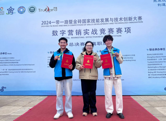 近日,2024一帶一路暨金磚國家技能發展與(yu) 技術創新大賽——數字營銷實戰競賽賽項全國總決(jue) 賽在鄭州落下帷幕。河南交通職業(ye) 技術學院物流學院2023級市場營銷專(zhuan) 業(ye) 學生任基騰、巴維琪同學在霍蘭(lan) 蘭(lan) 、王馨藝老師的指導下,從(cong) 激烈競爭(zheng) 中脫穎而出,獲得全國總決(jue) 賽銀獎,霍蘭(lan) 蘭(lan) 、王馨藝獲評“優(you) 秀指導教師”,學校獲得“優(you) 秀組織獎”。