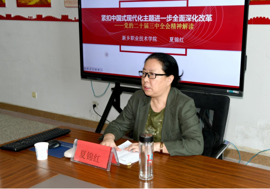 為(wei) 深入學習(xi) 貫徹黨(dang) 的二十屆三中全會(hui) 精神,10月18日上午,新鄉(xiang) 職業(ye) 技術學院校長夏錦紅在綜合樓建築學院黨(dang) 員活動室,為(wei) 建築學院、財經學院、院長辦公室黨(dang) 員開展以《緊扣中國式現代化主題進一步全麵深化改革》為(wei) 題的專(zhuan) 題黨(dang) 課。