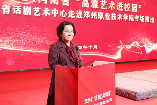黨(dang) 委書(shu) 記呂村代表全校師生對河南話劇藝術中心各位藝術家的到來,表示熱烈的歡迎和誠摯的感謝!呂書(shu) 記在講話中指出,習(xi) 近平總書(shu) 記在文藝工作座談會(hui) 上的重要講話中深刻闡明文化、文藝對一個(ge) 民族、對人類文明發展進步的重大作用、深遠影響。鄭州職業(ye) 技術學院自2012年以來堅持將“高雅藝術進校園”作為(wei) 開展大學生素質教育的重要載體(ti) ,引領師生“走進藝術、聆聽經典、陶冶情操、提高素養(yang) ”,形成充滿活力、多方協作、開放多元的學校美育新格局,有力引領了高質量校園文化的發展。她強調,當前,鄭州職業(ye) 技術學院正處在爬坡過坎、努力升本的建設中,需要我們(men) 鼓足十分幹勁。今天,我們(men) 重溫焦裕祿這位人民公仆感人至深的事跡,不僅(jin) 是一場文化藝術的盛宴,更是一堂思想政治課,一堂形式特殊的黨(dang) 課,希望大家要認真感悟話劇《焦裕祿》帶來的深刻意義(yi) ,從(cong) 中汲取力量,傳(chuan) 承偉(wei) 大精神,進一步激發自身的緊迫感、責任感和使命感,勇擔時代使命,砥礪實幹奮進,奮力書(shu) 寫(xie) 鄭州職業(ye) 技術學院職業(ye) 教育高質量發展的新篇章。