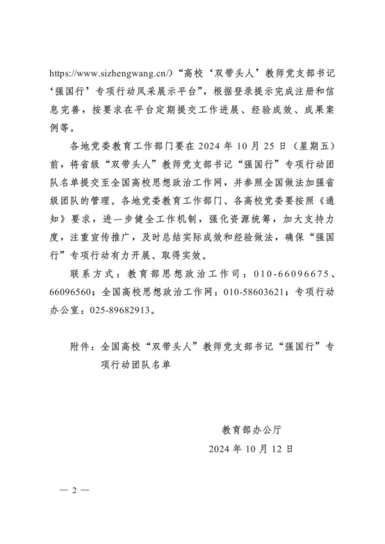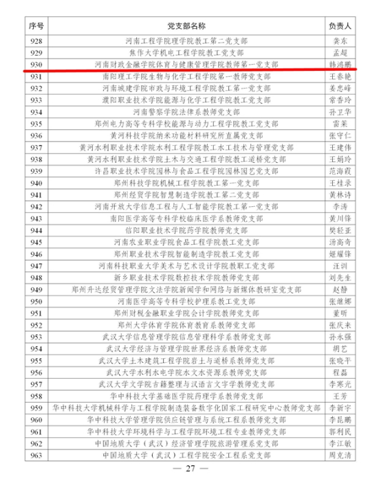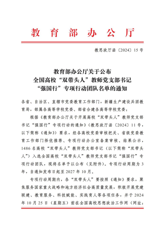 近日,教育部辦公廳印發《教育部辦公廳關(guan) 於(yu) 公布全國高校“雙帶頭人”教師黨(dang) 支部書(shu) 記 “強國行”專(zhuan) 項行動團隊名單的通知》(教思政廳函 〔2024〕15 號),河南財政金融學院體(ti) 育與(yu) 健康管理學院教師第一黨(dang) 支部入選全國專(zhuan) 項行動團隊。