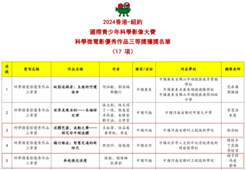 2024香港-紐約國際青少年科學影像大賽,於(yu) 10月1日至10月5日在在線上舉(ju) 行。鄭州工程技術學院管理學院、國際教育學院、傳(chuan) 媒學院共4項作品參加本次賽事的決(jue) 賽答辯,最終榮獲科學微電影專(zhuan) 項獎1項、二等獎2項、三等獎2項。“