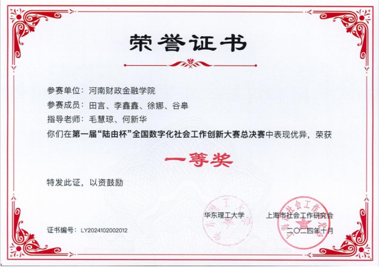 10月18日至20日,第一屆“陸由杯”全國數字化社會(hui) 工作創新大賽總決(jue) 賽在華東(dong) 理工大學徐匯校區舉(ju) 行。由法學院社會(hui) 工作專(zhuan) 業(ye) 學生田言、李鑫鑫、徐娜、穀皋等選手組成的河南財政金融學院代表隊表現卓越,榮獲本科組一等獎。