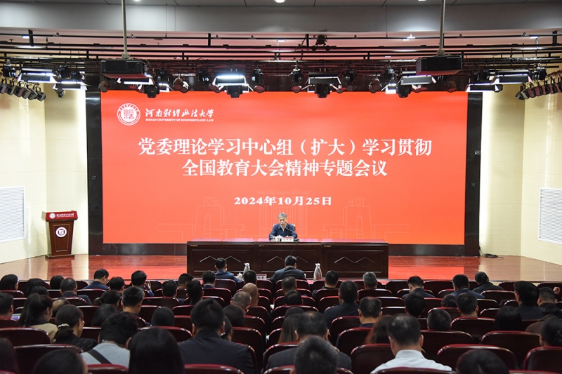 10月25日,河南財經政法大學黨(dang) 委書(shu) 記、校長司林勝主持召開黨(dang) 委理論學習(xi) 中心組(擴大)學習(xi) 會(hui) ,圍繞學習(xi) 貫徹習(xi) 近平總書(shu) 記重要講話和全國教育大會(hui) 精神作專(zhuan) 題報告。在校校領導,校黨(dang) 委理論學習(xi) 中心組成員,學部和獨立建製學院主要負責同誌,書(shu) 院及職能服務部門科級以上幹部參加會(hui) 議。