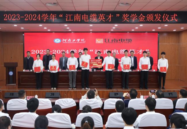 10月26日上午,河南工學院舉(ju) 行聯合辦學董事單位“江南電纜英才”“勵誌起帆”“成天泰菁英”獎學金頒發儀(yi) 式。副校長鄭先鋒,上海起帆電纜池州公司總經理周誌浩、深圳市成天泰電纜公司人資部長皮誌明、無錫江南電纜公司副總工程師劉軍(jun) 等出席儀(yi) 式,對外交流合作處、學生處、電纜工程學院、管理學院相關(guan) 負責人參加儀(yi) 式。頒獎儀(yi) 式由對外交流合作處負責人主持。