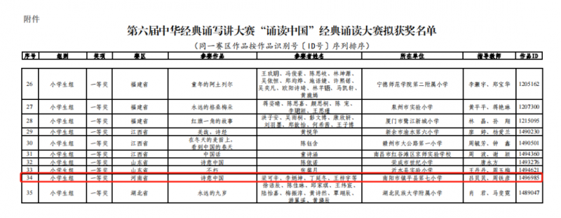 日前,從(cong) 第六屆中華經典誦寫(xie) 講大賽“誦讀中國”經典誦讀大賽組委會(hui) 獲悉,由鎮平縣第七小學梁可辛、李炳坤、丁延冬、王梓宇等16位學生參與(yu) 的誦讀作品《詩意中國》,經過緊張激烈的角逐,喜獲全國小學生組一等獎,係河南省小學組入選的三個(ge) 節目中唯一獲國賽一等獎者。指導老師呂貝貝、周鐵彥榮獲優(you) 秀指導教師獎。