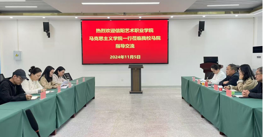 為(wei) 全麵加強馬克思主義(yi) 學院建設,推動學院內(nei) 涵式發展,11月5日下午,信陽藝術職業(ye) 學院馬克思主義(yi) 學院長白彬、副院長於(yu) 慧、各教研室主任等一行5人到信陽航空職業(ye) 學院馬克思主義(yi) 學院開展參觀交流活動。信陽航空職業(ye) 學院馬克思主義(yi) 學院院長方婷婷、各教研室主任及教師代表等參加了此次活動。