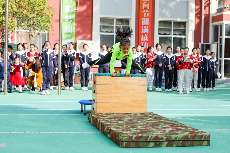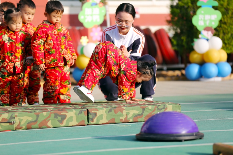 在體(ti) 能展示環節,幼兒(er) 園根據各年齡段孩子的特點,利用九宮格、四級箱、波速球、木梯、S彎、踏板、蹺蹺板、單杠、斜坡墊、攀爬架、正負極、側(ce) 騰躍等30餘(yu) 種器械,設置了不同難度的體(ti) 能展示環節。孩子們(men) 不斷調整姿勢,用貓腰、翻滾、跳躍、搖擺、空翻等連貫動作展示體(ti) 能,動作流暢,四肢有力,沿著各種器械搭成的賽道直達終點,展示出良好的體(ti) 能、非凡的技巧、頑強的毅力和勇敢的品格。