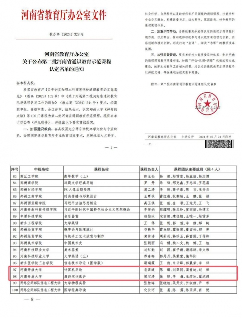 近日,kaiyun体育登入口下發《關(guan) 於(yu) 公布第二批河南省通識教育示範課程認定名單的通知》(教辦高〔2024〕328 號),全省100門課程入選。河南開放大學《唐詩宋詞選講》和《計算機導論》2門課程獲得認定。