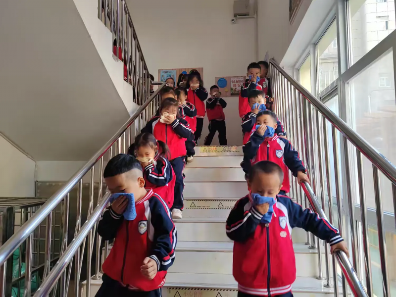 警報拉響,有序疏散。當消防警鈴響徹全園時,所有教職工立即停下手中的工作,各樓道安全員迅速到位,老師們(men) 迅速帶領孩子拿起濕毛巾捂住口鼻、彎腰低身,按緊急疏散路線分樓層、分區域、有秩序地從(cong) 班級撤離,疏散到安全地帶。