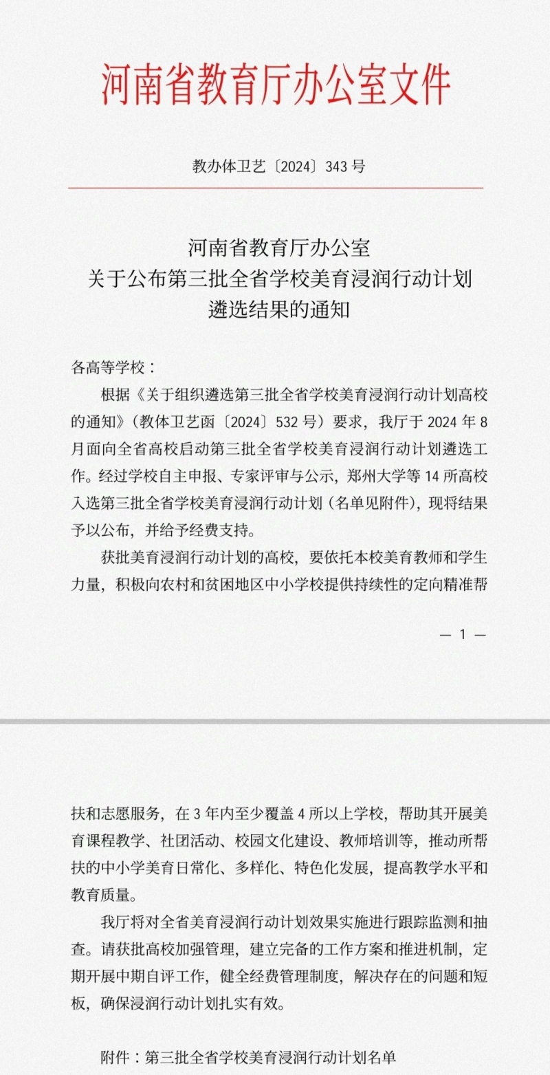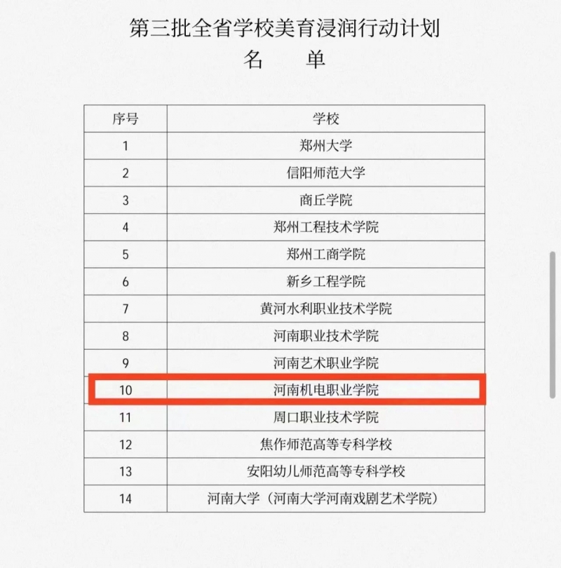 根據kaiyun体育登入口辦公室《關(guan) 於(yu) 組織遴選第三批全省學校美育浸潤行動計劃高校的通知》的相關(guan) 要求,經過嚴(yan) 格評審與(yu) 激烈競爭(zheng) ,河南機電職業(ye) 學院成功入選第三批全省學校美育浸潤行動計劃。