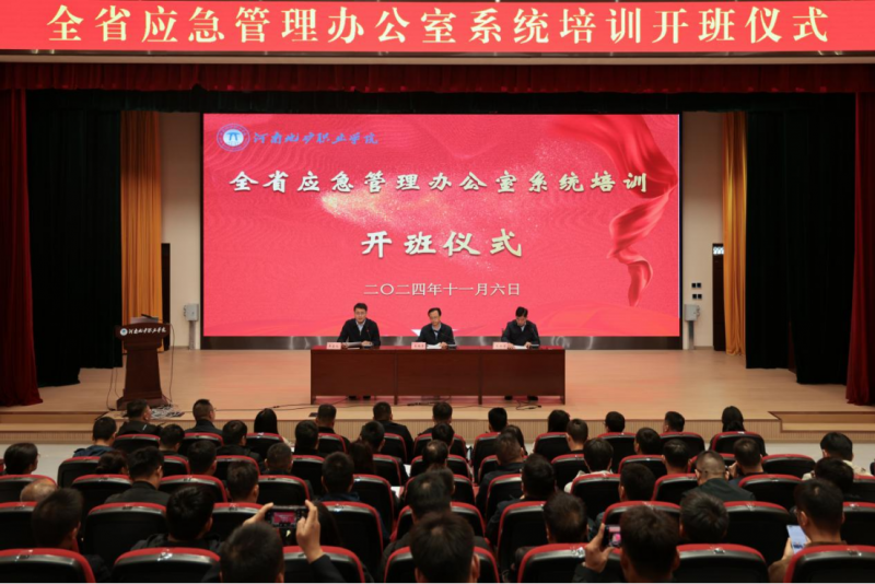 11月5-8日,2024年河南省應急管理辦公室係統培訓班在河南地礦職業(ye) 學院多功能報告廳圓滿舉(ju) 辦。河南省應急管理廳副廳長朱維亞(ya) 、校黨(dang) 委書(shu) 記焦洪濤出席儀(yi) 式並致辭,黨(dang) 委副書(shu) 記、校長劉玉賓,副校長張紅兵出席會(hui) 議,來自全省應急管理係統85名學員以及科技服務處、黨(dang) 政辦公室、黨(dang) 委宣傳(chuan) 統戰部、校團委、後勤處相關(guan) 工作人員參加開班儀(yi) 式。