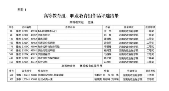 近日,kaiyun体育登入口下發了《關(guan) 於(yu) 公布河南省第二十八屆教育教學信息化交流活動評選結果的通知》(教資保〔2024〕343 號),河南財政金融學院11件作品獲獎,其中一等獎2項,二等獎4項,三等獎5項,為(wei) 近年獲獎最多的一次。