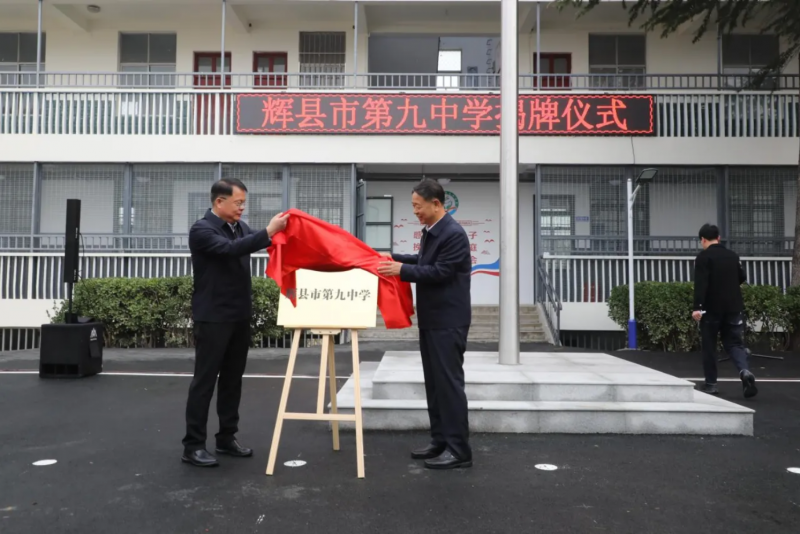新鄉(xiang) 市副市長、公安局局長朱東(dong) 亞(ya) 與(yu) 輝縣市委書(shu) 記李繼遊共同為(wei) “輝縣市第九中學”揭牌。