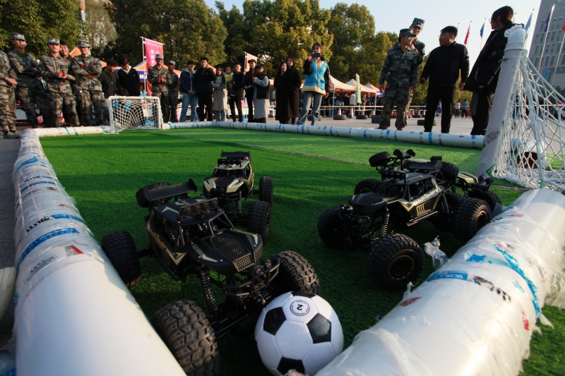 活動中,遙控汽車足球賽引得學生紛紛駐足觀看