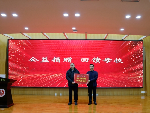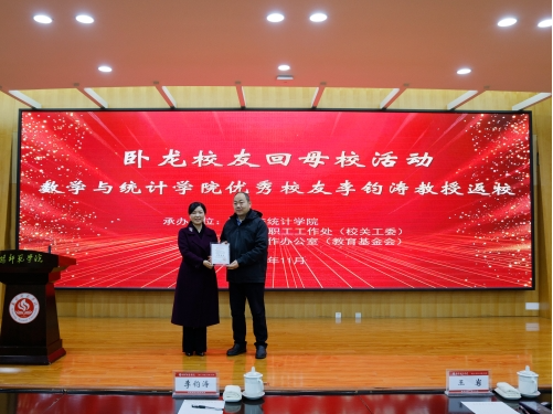數學與(yu) 統計學院黨(dang) 委書(shu) 記冷元峰代表學院接受李鈞濤教授的第二輪公益獎學金捐贈,並為(wei) 李鈞濤教授頒授捐贈證書(shu) ;學校關(guan) 工委進行了“臥龍校友回母校工作驛站”授牌。