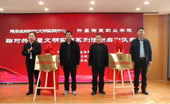 儀(yi) 式中,李夢龍、王耀軒、肖紹俊、張道金共同為(wei) 建安區新時代文明實踐許昌陶瓷職業(ye) 學院分中心、許昌陶瓷職業(ye) 學院共建基地揭牌。