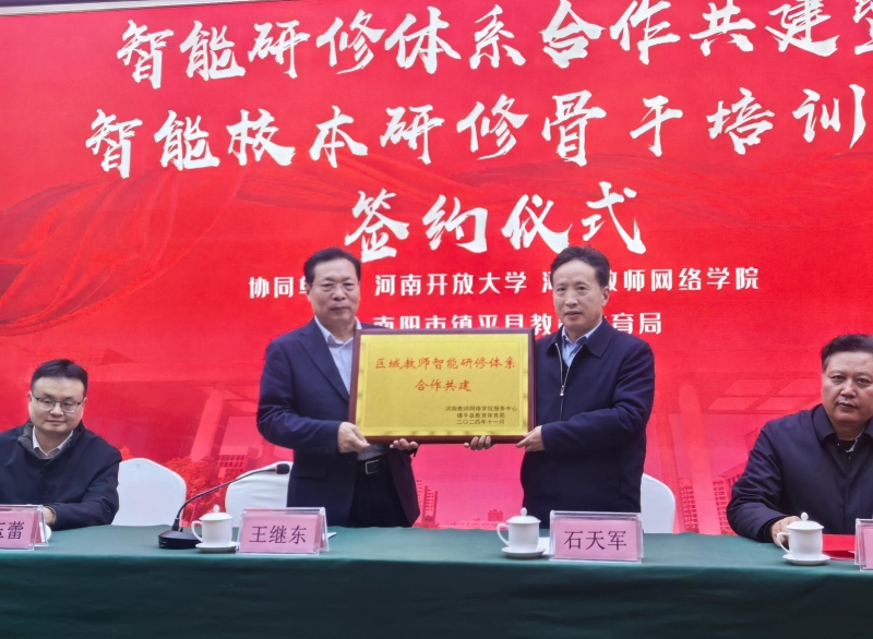 會(hui) 上,鎮平縣教體(ti) 局一級主任科員李哲與(yu) 河南開放大學河南教師網絡學院主任肖立誌代表雙方簽訂合作協議書(shu) ,王繼東(dong) 和石天軍(jun) 共同為(wei) 合作共建揭牌。簽約儀(yi) 式的成功舉(ju) 行,為(wei) 鎮平縣形成線下線上融合的混合動態延伸培訓模式,推動教師發展的交互性、伴隨性、智能化和個(ge) 性化開啟了新的探索與(yu) 實踐。