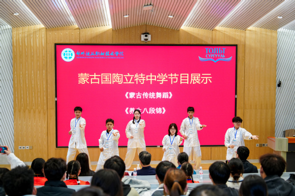 儀(yi) 式上,鄭州鐵路職業(ye) 技術學院國際教育學院學生表演了古箏演奏《戰台風》、二胡演奏《賽馬》。蒙古國陶立特中學學生帶來了蒙古傳(chuan) 統舞蹈和“養(yang) 生八段錦”表演。