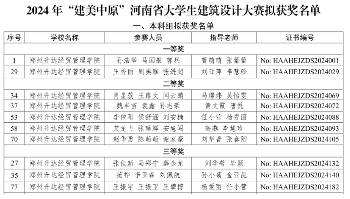 近日,由河南省高等教育學會(hui) 主辦的2024“建美中原”河南省大學生建築設計大賽在平頂山盛大啟幕。在整個(ge) 參賽曆程中,鄭州升達經貿管理學院師生呈現出卓越的專(zhuan) 業(ye) 素養(yang) 和團隊協作能力,最終榮獲一等獎2項、二等獎5項、三等獎3項的優(you) 異成績。