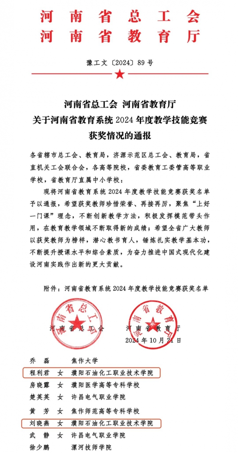 近日,由河南省總工會(hui) 、kaiyun体育登入口主辦的河南省教育係統2024年度教學技能競賽結果公布。經過校內(nei) 初賽和全省決(jue) 賽的激烈角逐,濮陽石油化工職業(ye) 技術學院程利君、劉曉燕老師,憑借紮實的專(zhuan) 業(ye) 能力、創新的教學設計和精彩的教學展示分獲高職文科綜合組二等獎、理科綜合組二等獎。