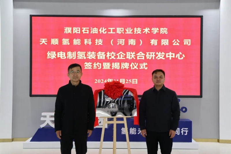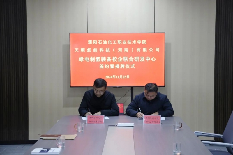 11 月 25 日上午,濮陽石油化工職業(ye) 技術學院與(yu) 天順氫能科技(河南)有限公司在天順氫能會(hui) 議室舉(ju) 行共建綠電製氫工藝校企聯合研發中心簽約暨揭牌儀(yi) 式。天順氫能科技(河南)有限公司副總經理李欣欣、商務負責人張迪,濮陽石油化工職業(ye) 技術學院副院長趙懷森出席儀(yi) 式,雙方相關(guan) 負責人及教師代表參加活動。
