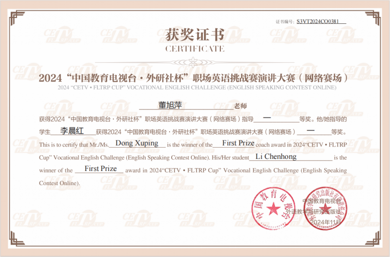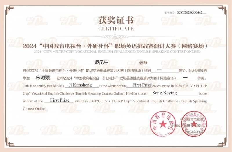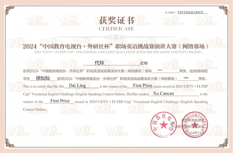 近日,“中國教育電視台·外研社杯”職場英語演講挑戰賽網絡賽場決(jue) 賽成績揭曉,平頂山職業(ye) 技術學院外語係組織參賽的五位選手(宋珂穎、李東(dong) 東(dong) 、陳琳、徐燦燦、李晨紅)全部榮獲一等獎。