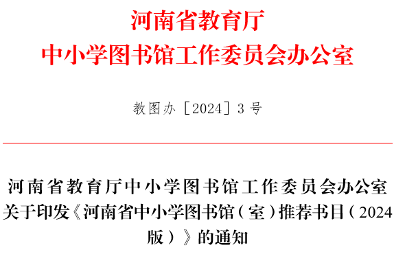 請按照《通告》要求,將《河南省中小學圖書(shu) 館(室)推薦書(shu) 目(2024版)》作為(wei) 中小學圖書(shu) 館招標采購的主要依據。