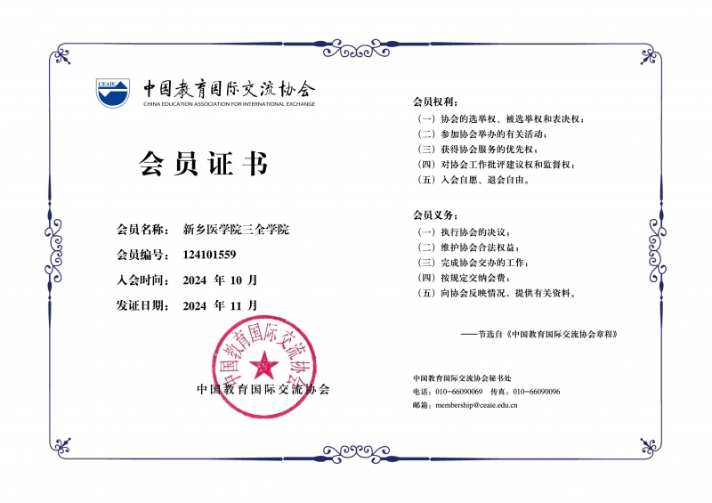 新鄉(xiang) 醫學院三全學院成為(wei) 中國教育國際交流協會(hui) 會(hui) 員單位後,將享有優(you) 先參加協會(hui) 主辦、支持及協辦的各類教育國際交流合作項目,享受跨境質量保障(中外合作辦學、來華留學)等相關(guan) 服務,優(you) 先享受國際教育交流領域的信息谘詢與(yu) 政策指導。