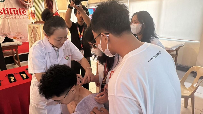 作為(wei) 首次海外線下課程,本次培訓自9月份開始籌備,南陽醫學高等專(zhuan) 科學校悉心選拔優(you) 秀教師,精準聚焦海外院校需求,精心設計培訓課程,內(nei) 容涵蓋了針灸推拿、中醫骨傷(shang) 、傳(chuan) 統拔罐、特色艾灸療法、刮痧理論等內(nei) 容,在菲律賓連續開展10餘(yu) 場培訓。隨著課程的開展,慕名而來的學員越來越多,有些學員為(wei) 了占位放棄午餐,大家排隊在老師的指導下親(qin) 身體(ti) 驗,紛紛折服於(yu) 中醫治療立竿見影的效果,表示一定要來到學校更深入地係統學習(xi) 中醫適宜技術課程,讓自己有機會(hui) 從(cong) 學員轉變為(wei) 教師,從(cong) 體(ti) 驗者轉變傳(chuan) 播者,有力傳(chuan) 播中醫技術,弘揚中醫藥文化,讓中醫藥惠及更多國際友人。