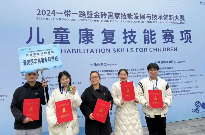 2024年11月29日至12月1日,2024一帶一路暨金磚國家技能發展與(yu) 技術創新大賽兒(er) 童康複技能賽項在重慶醫藥高等專(zhuan) 科學校舉(ju) 辦。濮陽醫學高等專(zhuan) 科學校選手在比賽中榮獲佳績,2023級康複治療技術一班學生張靈鑫榮獲言語賽道二等獎,2023級康複治療技術一班李小宇榮獲感統賽道優(you) 秀獎,2023級中醫康複技術二班丁訓獲孤獨症賽道優(you) 秀獎,邊旭昭榮獲優(you) 秀指導老師,濮陽醫學高等專(zhuan) 科學校榮獲最佳組織獎。