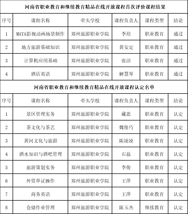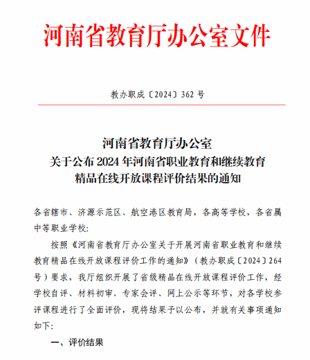 近日,kaiyun体育登入口辦公室發布了《關(guan) 於(yu) 公布2024年河南省職業(ye) 教育和繼續教育精品在線開放課程評價(jia) 結果的通知》(教辦職成〔2024〕362號),鄭州旅遊職業(ye) 學院2021年立項建設的8門精品在線開放課程二次評價(jia) 通過,被認定為(wei) 河南省精品在線開放課程;2022年立項建設的4門精品在線開放課程獲kaiyun体育登入口首次評價(jia) 通過。
