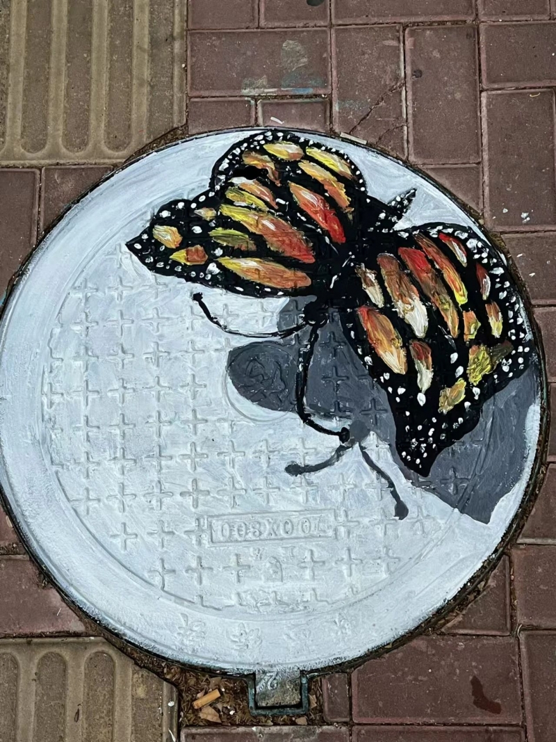 在活動現場,誌願者趙柯穎和同學們(men) 以井蓋為(wei) “畫布”,利用井蓋的形狀和外貌特征,運用顏料和畫筆,在凹凸不平的井蓋上畫出自己心中的“美好世界”,色彩絢麗(li) 充滿童趣的畫作吸引著來往群眾(zhong) 的駐足觀摩和交口稱讚。