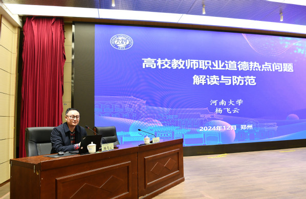 楊飛雲(yun) 教授以《高校教師職業(ye) 道德熱點問題新解》為(wei) 題,結合黨(dang) 的二十屆三中全會(hui) 精神和全國教育大會(hui) 精神,從(cong) 三個(ge) 方麵係統解讀了高校師德師風建設。一是從(cong) 師德師風工作的指導思想、立德樹人涵義(yi) 的演進、立德樹人與(yu) 師德素養(yang) 的關(guan) 係等方麵,詳細解讀了師德素養(yang) 的時代內(nei) 涵;二是深入剖析了近年來高校領域發生的多起師德失範典型案例,聚焦師德師風建設麵臨(lin) 的新形勢和加強師德師風建設的重要意義(yi) ,深入淺出地闡釋了新時代高校教師應遵守的職業(ye) 行為(wei) 規範;三是從(cong) 教學實踐中體(ti) 現師德、學生生活中滲透師德、教師反思中凝練師德、恪守職責中踐行師德、師德失範行為(wei) 警示中提升師德、敬畏生命中融入師德等六個(ge) 方麵,為(wei) 學校進一步加強新時代師德師風建設提出了寶貴建議。